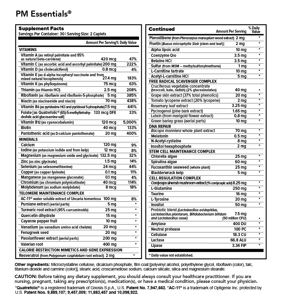 PM Essentials® delivers a powerful blend of vitamins, minerals, antioxidants, botanicals, probiotics, and longevity nutrients that work overnight to support: